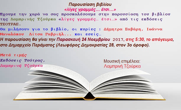 Έχουμε την χαρά να σας προσκαλέσουμε στην παρουσίαση του βιβλίου της Λαμπρινής Τζούρκα «λίγες γραμμές… έτσι…» από τις εκδόσεις ΤΣΟΤΡΑΣ.